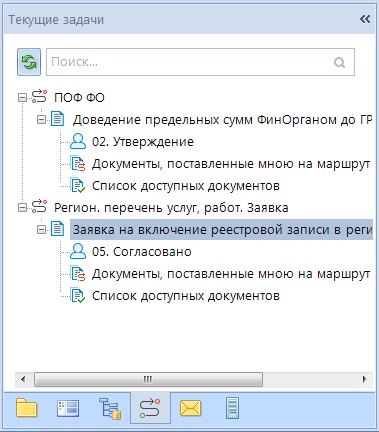 В панели текущих задач отображаются доступные текущему пользователю маршруты и задачи приложения. Доступ к маршрутам определяется по принадлежности пользователя к исполнителям отдельных задач маршрута.