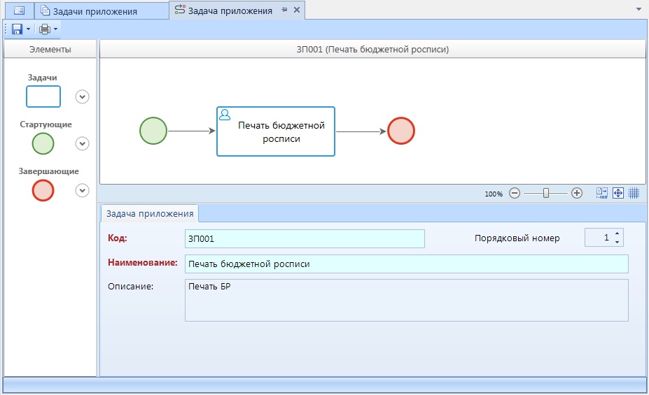 Из элементов в задаче приложения доступны только простое стартовое событие, задача и простое завершающее событие. Таким образом, для построения схемы задачи приложения необходимо добавить их в область дизайнера, соединить линиями связи и заполнить свойства объекта Задача. При выделении задачи на схеме внизу окна редактирования становятся доступны её параметры, сгруппированные по вкладкам.