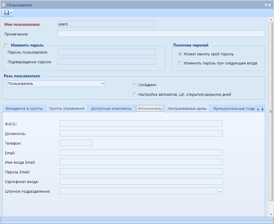 - Имя входа – поле используется для выбора сотрудника из списка пользователей программного комплекса. После выбора поля ФИО, Должность, Примечание пользователя заполняются автоматически из соответствующих атрибутов учетной записи.