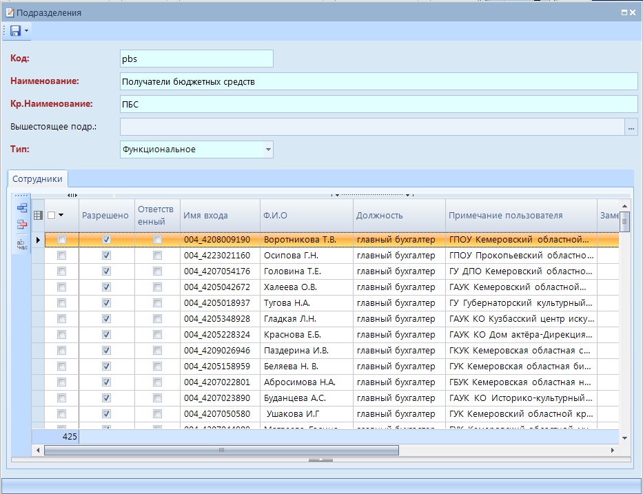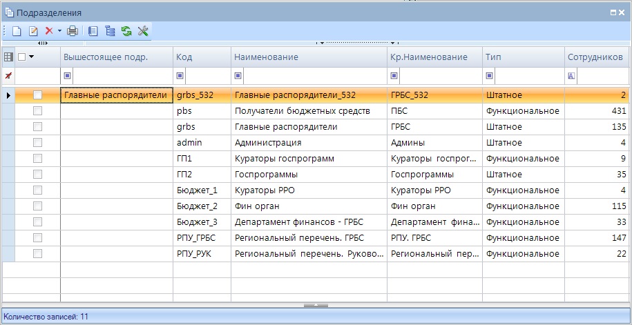 - Вышестоящее подр. – вышестоящее подразделение. Выбирается из текущего справочника. Каждое подразделение может иметь только одно вышестоящее подразделение или не иметь вышестоящего подразделения. Уровень вложенности дерева подразделений ограничен до 10.