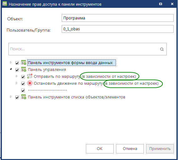 В окне Назначение прав доступа к панели инструментов доступны следующие настройки:
