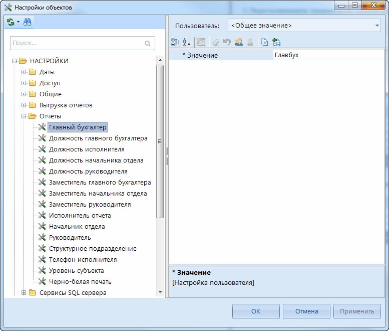 Настройки поддерживают ввод индивидуальных значений для всех пользователей, их значения используются при построении отчетов, в частности для формирования подписей отчетов: