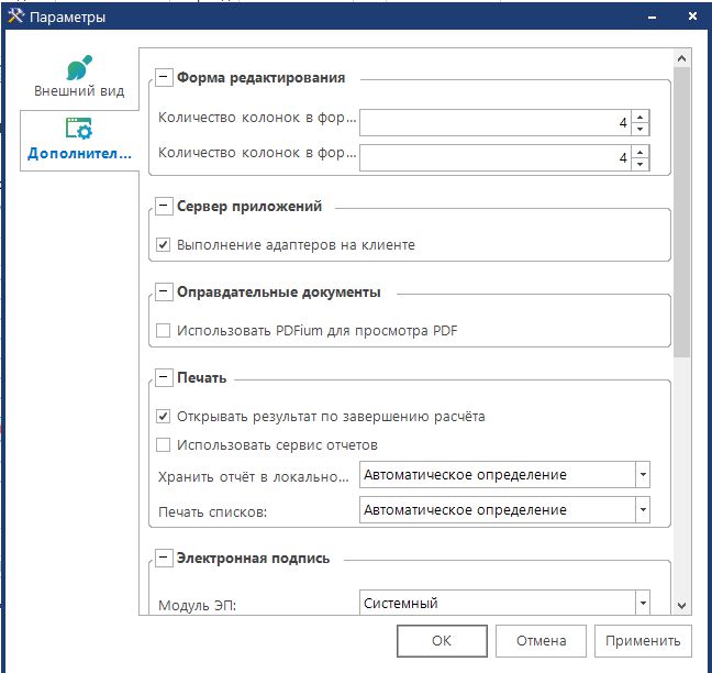 Настройка используется для настройки внешнего вида программного комплекса, параметров печати, электронной подписи.