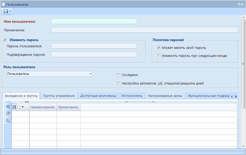 - «Пользователь с расширенными правами» - учётная запись наделена, помимо стандартных прав доступа, дополнительными возможностями по управлению отмеченными группами (вкладка «Группы управления») и настройке АРМов (вкладка «Настраиваемые армы»),