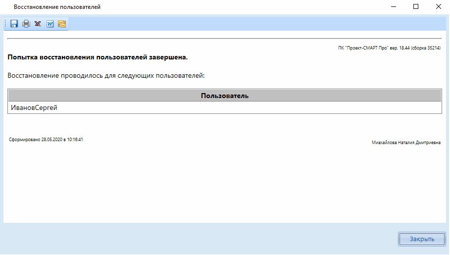 Список восстановленных учётных записей пользователей отобразится в соответствующем протоколе.