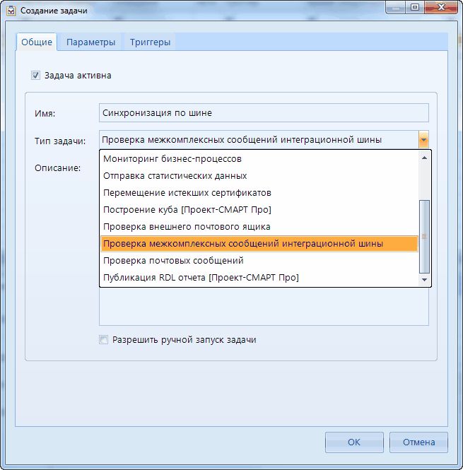 - Проверка межкомплексных сообщений - проверяет новые сообщения между комплексами. При выборе данного действия в окне Создание задачи появится дополнительная вкладка Параметры, в которой необходимо будет указать параметры подключения к базе.